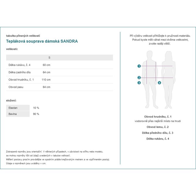 Rozměry kompletu ve velikosti S jsou měřeny naplocho: šířka v podpaží - 55 cm, délka mikiny - 64 cm, délka rukávu - 60 cm, šířka pasu - 32 cm, délka nohavice - 101 cm