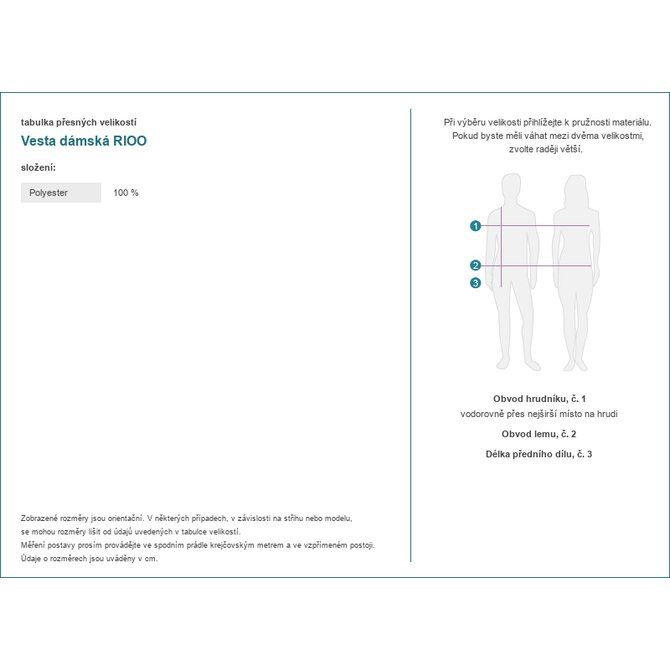 Rozměry vesty ve velikosti S jsou měřeny naplocho: šířka pod podpaží - 50 cm, celková délka - 96 cm.