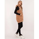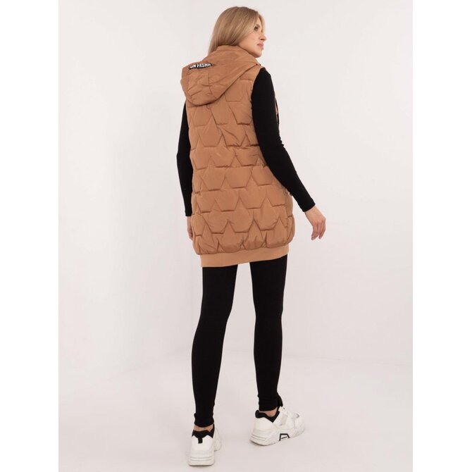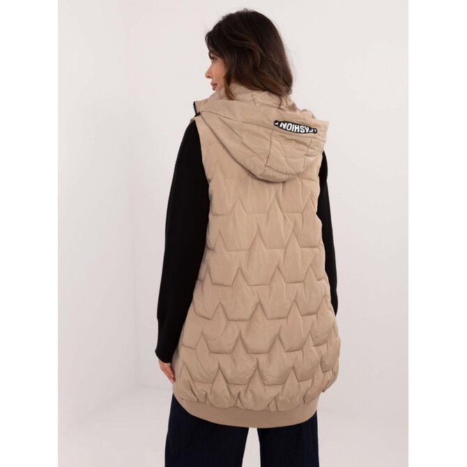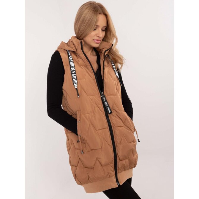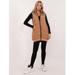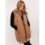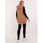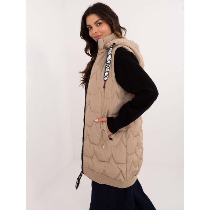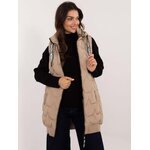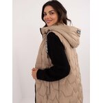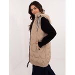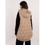 Dámská prošívaná dlouhá vesta s odnímatelnou kapucí ve světle hnědé barvě;