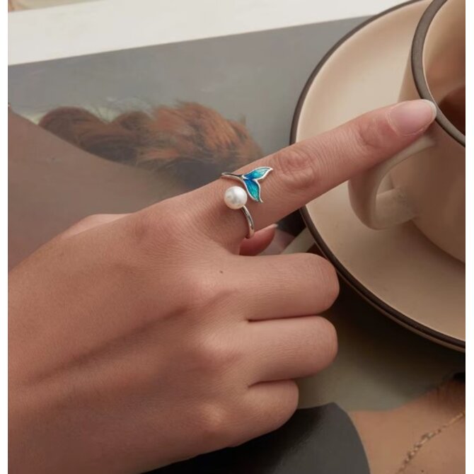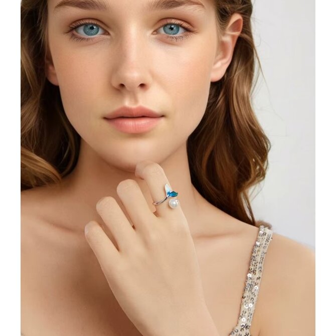 Stříbrný otevřený prsten s perlou Mořská panna zelená, stříbro Ag 925/1000
