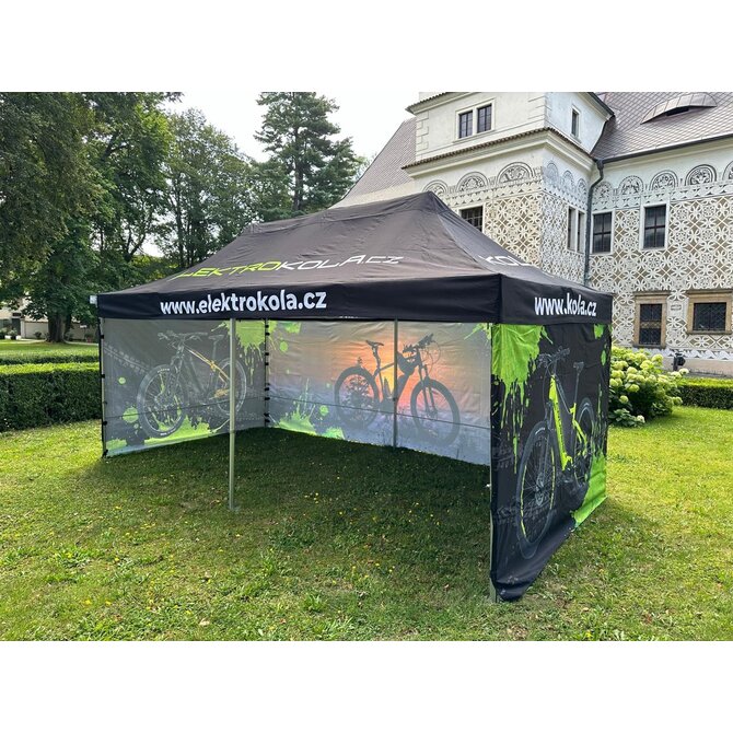 VARIANTA 3- střecha s kompletním celopotiskem vrchní části i volánů + 2x bočnice 3m + 1x bočnice 6m s kompletním jednostranným celopotiskem + 2x polobočnice 3m s kompletním jednostranným celopotiskem