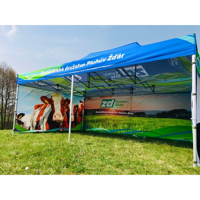 VARIANTA 1- střecha s kompletním celopotiskem vrchní části i volánů + 2x bočnice 3m + 1x bočnice 6m s kompletním jednostranným celopotiskem