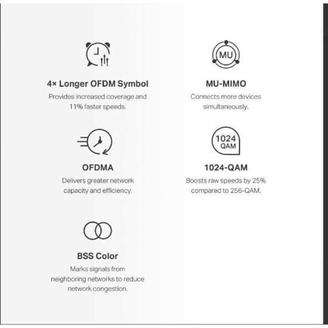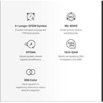 Citlivost příjmu: 2.4 GHz (11g 6 Mbps: -96.5 dBm, 11g 54 Mbps: -78 dBm), 5 GHz (11a 6 Mbps: -96 dBm, 11a 54 Mbps: -78 dBm, 11ac VHT20 MCS8:- 74.5 dBm, 11ac VHT40 MCS9: -70.5 dBm, 11ac VHT80 MCS9: -66.5 dBm, 11ax HE20 MCS11: -66 dBm, 11ax HE40 MCS11: -63 dBm, 11ax HE80 MCS11: -61 dBm)