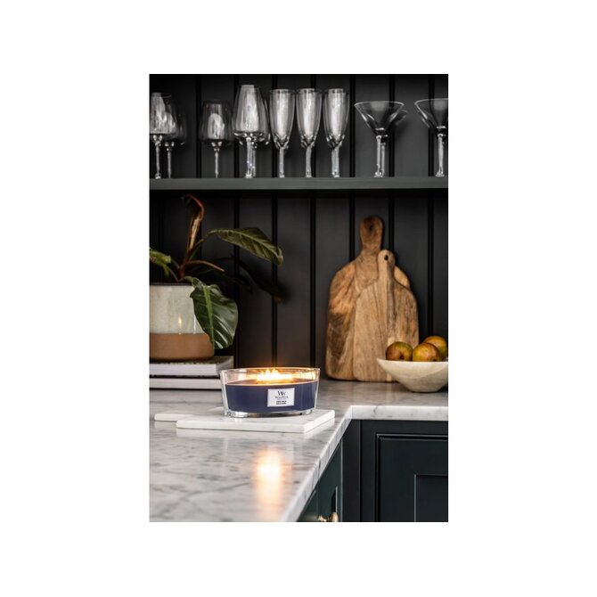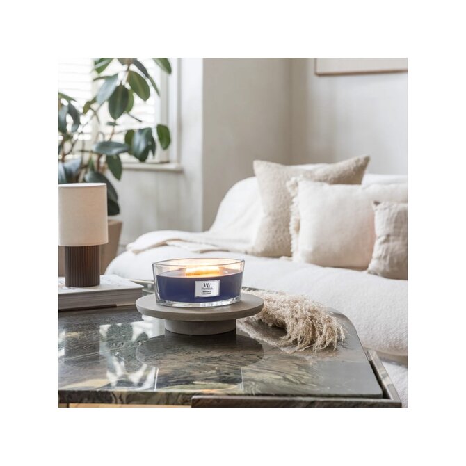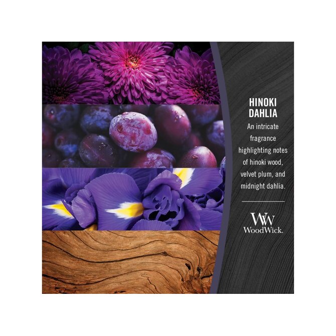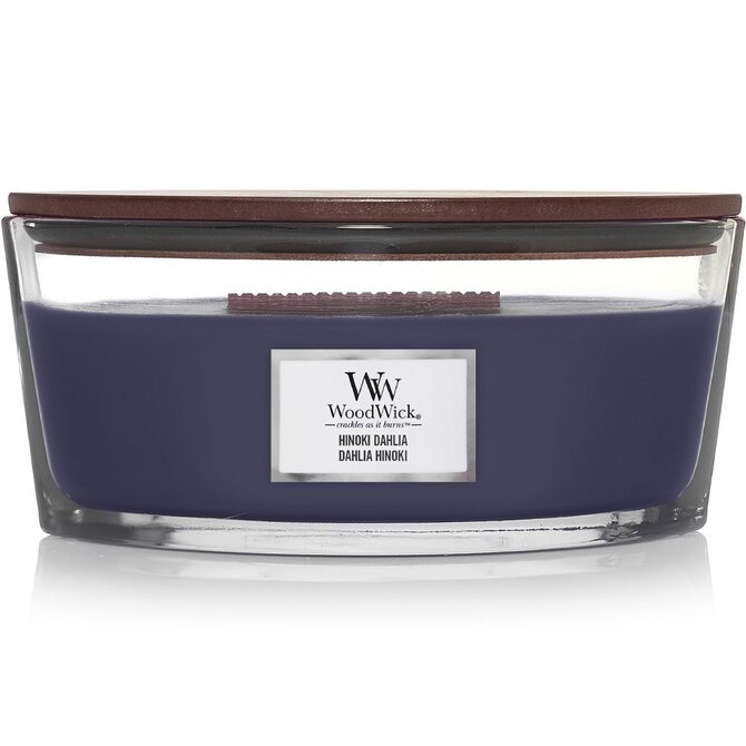 WoodWick vonná svíčka s dřevěným knotem Elipsa Hinoki Dahlia 453 g Modrá