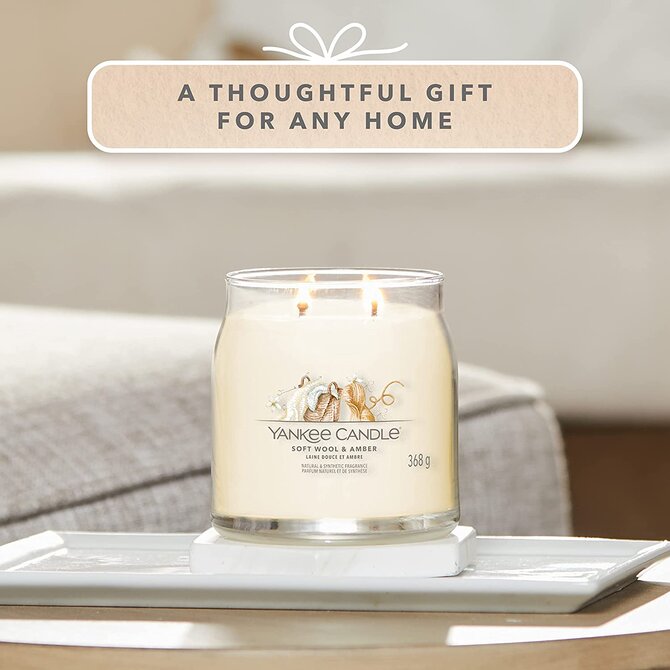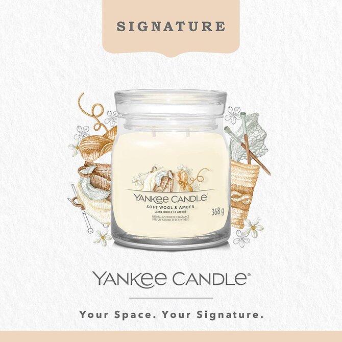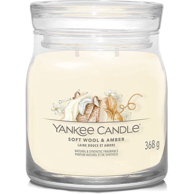 Yankee Candle vonná svíčka Signature ve skle střední Soft Wool & Amber 368g Krémová
